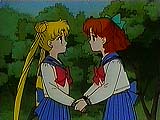 The Scouts found Rini, but she didn't remember any of them and ran off. A droid appeared and threatened her, and the Scouts protected Rini with their attacks. Rini ran away, and Sailor Moon followed her. Sailor Moon got ahead of Rini and told her that the Scouts were her friends. Rini believed her, and asked Sailor Moon to save her mother. She showed Sailor Moon her mother's palace, but a building in the background toppled over and Luna ran up told Sailor Moon that the Scouts needed help. Sailor Moon ran off telling Luna and Artemis to protect Rini. The Scouts decided the best way to save Rini would be to save her mother in the dream. The droid appeared, and the ground cracked beneath them. Rini was about to fall when Sailor Moon grabbed her, and told Rini she'd always protect her. Sailor Moon pulled Rini up, and as the droid unleashed power at Sailor Moon deflected the it one-handed. Energy surrounded Sailor Moon, and she sent the droid flying. She said she wouldn't forgive him for trying to hurt a small child. They saved her mother, and return from Rini's dream. Rini woke up, and asked Sailor Pluto to return her to the future. Pluto replied that the enemy had a new plan, and that the Scouts would take care of her. Rini got upset as Pluto faded away and the luna ball returned. Emerald took over after Rubeus. She thought a better way to take over the earth would be to place a crystal figurine in a place with negative energy. The figurine would absorb the energy. When they were all in place and the Black Gate opened, the Black Crystal would destroy the world. Meanwhile, Serena started having the same dreams as Darien. She dreamed that they were getting married, but they were pulled apart and everything exploded. She woke up and picked up a photo. The glass cracked. Serena pounded on Darien's door and mentioned the dream. Surprised, he let her in and told her they couldn't be together. He'd had the dreams so many times he thought they're a prediction of the future. Serena said she didn't care if they were a prediction, unless they could be together. Darien replied they couldn't, and pushed her out the door. Later Serena told him if it wasn't a good idea for them to get married, she didn't care as long as they were together. The Scouts and Rini decided to go to the future. Rini wasn't sure they could defeat the enemy, but knew she couldn't run away from her fears anymore. Rini lifted her key and activated it. She asked the God of Time to allow them passage through the Door of Time. The wind rose around them, and they disappeared as a beam of light descended from the clouds. Sailor Moon found herself alone. She saw a building ahead, but was stopped by an indistinct figure. She told Sailor Moon she had broken a time taboo. Rini ran in front of Sailor Moon, and cried out to Sailor Pluto to not hurt her. She said she was sorry she'd broken her promise of not bringing people with her, but she thought that the Scouts could help. Sailor Pluto was pleased that Rini had Mastered the Key of Time, and thought she was maturing. She also remarked that Sailor Moon had always been troublesome to her (foreshadowing of Sailor Moon S). Pluto opened the gate and let them enter the corridor of time to the gateway of Crystal Tokyo. As Pluto watched them go, Luna remarked she'd heard Queen Serenity speak of Sailor Scouts who had to remain at their post at all times. Pluto was a lonely warrior who, because of her duty, had to live out her life in the Nether Realm alone. Sailor Pluto closed the gate. On the Dark Moon Diamond noticed the Scouts, and was amazed that they were trying to pass through the corridor. Wiseman appeared, and said that when they caught the rabbit and the silver crystal, the Dark Crystal would be invincible. Diamond focused on Sailor Moon, and said she was beautiful. After Wiseman left, Diamond told Emerald to bring Sailor Moon to him, unharmed. This startled Sapphire and Emerald. After Diamond left, Sapphire said it was all Wiseman's doing. He thought Wiseman was manipulating Diamond, and wanted to rip off Wiseman's cloak. Emerald agreed, but said she'd capture the rabbit and the silver crystal. But she vowed to kill Sailor Moon. The Scouts were fighting hard against the windy tunnel. Emerald appeared above them and blasted them. Tuxedo Mask and Sailor Moon lost their grip on Rini, and they all went flying. Emerald ordered a droid to kill everyone but the rabbit. She realized she'd forgotten to order it not to kill Sailor Moon, but didn't care. The Scouts found each other, worried because they couldn't find Tuxedo Mask or Rini. Suddenly the silver crystal started glowing, and in the distance a glow answered it. They thought it was the silver crystal of the future. Meanwhile, Rini was alone with her luna ball. The droid approached her dressed as Neo-Queen Serenity, but Rini saw through it and yelled for luna ball. The ball clobbered the droid, and Rini turned it into a sling shot. Her shots had no effect, but the Scouts arrived! The droid couldn't believe they had gotten through the gateway, but Sailor Moon replied that luck was on their side. The Scouts tried their attacks, with no luck, and Mercury analyzed the droid. She said the only way to defeat it was Sailor Planet Power, but Sailor Moon pointed out they would be attacked while they powered up. Rini told them she'd distract the droid, and staggered it with her moon beam. The droid angrily shot a blast at Rini, but Tuxedo Mask scooped her up in time. The Scouts finished powering up and destroyed the droid.