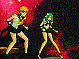 Sailor Moon Sailor Stars Episode 167 - 200 I will be using the Japanese names. For a conversion table, go here Rei came and visited Usagi's house later. Rei asked her if she had decided, and Usagi went to her desk and looked at her picture of Mamoru. She started crying, and wondered what Mamoru was doing now. Rei couldn't believe it, and asked if they had been communicating. Usagi said there weren't any replies since the beginning, and Rei asked why she hadn't said anything! The final concert was coming up for the Three Lights. The Princess told them to cooperate with the Sailor Senshi, but Taiki and Yaten said they could defeat Galaxia themselves. Ami said she'd called the university in America, but Mamoru hadn't arrived yet. Usagi and Chibi Chibi were walking in the rain, and Haruka and Michiru came by and told her not to see Seiya. They said she liked Mamoru, but she said she liked everyone. Haruka and Michiru told her to say good-bye to Seiya. Before the final concert, they arrived. Seiya asked if they could be alone, and Haruka said they had 5 minutes. Seiya said he had been serious, and that he liked her a lot. He said he would go all out for the final concert, and that he hoped she would meet her boyfriend soon. Usagi apologized, but Seiya said it wasn't her fault. Then he kissed her on the cheek, and said he wished he could have met her sooner. During the last song of the concert, Chibi Chibi began to glow. Then Tin Nyanko appeared on the stage, and said she wanted the star seed. Neptune, Uranus, and the Princess appeared on the stage. The Princess said that Tin Nyanko only had one bracelet so her memories as a Sailor Scout were returning. The Three Lights transformed, and Nyanko attacked. Then Eternal Sailor Moon appeared. The Starlights and Uranus and Neptune started arguing, and the Princess told them to stop fighting. Sailor Moon said they had to be one. Galaxia appeared on the stage and took Nyanko's bracelet. She spotted the Princess, and started attacking her. The Princess created a force field, but Galaxia kept blasting and blasting and eventually she lost. Galaxia took out her star seed. Sailor Moon used her "Silver Moon Crystal Power Kiss" on Galaxia, but Galaxia just stood there and it didn't affect her. Then she left. The Princess told the Starlights to combine their powers. Sailor Chibi Chibi held onto the Princess' hand, and the Princess whispered, "A warm feeling". Then she died. Galaxia left the stage and everything started falling apart. Galaxia appeared on the TVs and said that the galaxy belonged to her and she wouldn't allow ugliness. The Starlights said that was the same thing that had happened on their planet. Mercury used her computer and located Galaxia at Ginga TV. The Starlights started to leave. The Sailors tried to stop them, but they said it was their duty to protect the princess, and since they had failed, they would take revenge on Galaxia. Then a black stream of lightning came down from the sky towards Sailor Moon, but Sailor Saturn used her attack "Silent Wall" and blocked the attack. Pluto and Saturn appeared. At Ginga TV, Galaxia trapped the Starlights and brought them to her dimension.