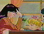 Setsuna, Haruka, and Michiru approach Usagi, who is facing a food stand. Haruka taps her on the shoulder, and she turns around (Setsuna, Haruka, and Michiru are very surprised). Usagi is shown to eating a fish cookie? and holding two ice cream cones in each hand. She munches on the fish cookie, which is halfway out of her mouth, and grins.
